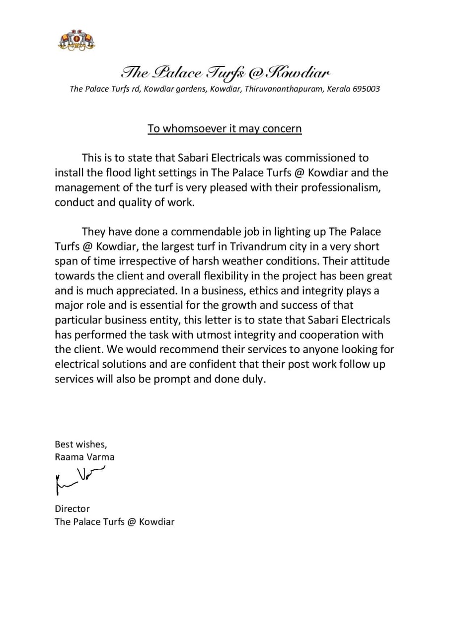 They have done a commendable job in lighting up The Palace Turfs @ Kowdiar, the largest turf in Trivandrum city in a very short span of time irrespective of harsh weather conditions. Their attitude towards the client and overall flexibility in the project has been great and is much appreciated. In a business, ethics and integrity plays a major role and is essential for the growth and success of that particular business entity, this letter is to state that Sabari Electricals has performed the task with utmost integrity and cooperation with the client. We would recommend their services to anyone looking for electrical solutions and are confident that their post work follow up services will also be prompt and done duly.